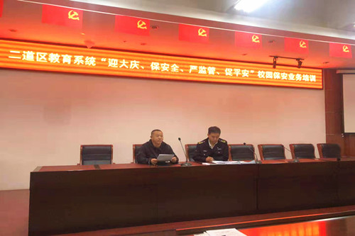 為深入貫徹落實(shí)2019年9月4日公安部、教育部視頻會(huì)議精神,進(jìn)一步加強(qiáng)中小學(xué)(幼兒園)安全管理工作,有效防范針對(duì)未成年學(xué)生和幼兒暴力傷害事件的發(fā)生,保護(hù)師生生命財(cái)產(chǎn)安全,依據(jù)國(guó)務(wù)院教育督導(dǎo)委員會(huì)辦公室關(guān)于進(jìn)一步加強(qiáng)中小學(xué)(幼兒園)安全工作的緊急通知要求,全面落實(shí)長(zhǎng)春市學(xué)校(幼兒園)安全防范工作“十五條”硬性措施,9月22日上午,文教大隊(duì)副大隊(duì)長(zhǎng)劉海波及駐二道區(qū)中小學(xué)校90名保安員參加了二道區(qū)教育局舉行的“迎大慶、保安全、嚴(yán)監(jiān)管、促平安”保安業(yè)務(wù)培訓(xùn)會(huì)。二道區(qū)教育局安全科相關(guān)領(lǐng)導(dǎo)、各中小學(xué)主管安全的副校長(zhǎng)、教師參加了培訓(xùn)會(huì)。
