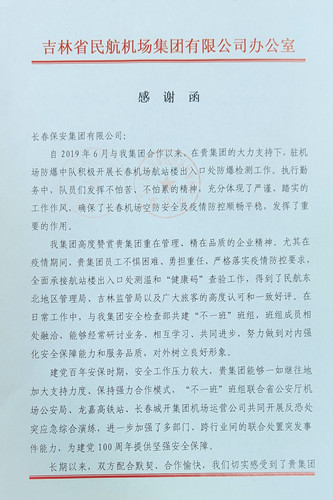 ? ?王主任表示,姜英民總經(jīng)理經(jīng)常向集團(tuán)領(lǐng)導(dǎo)以及集團(tuán)部門稱贊長春保安集團(tuán)九臺分公司駐長春龍嘉國際機(jī)場安檢防爆隊各項工作都做的非常扎實(shí)且表現(xiàn)突出。我們也切實(shí)感受到了駐勤安檢隊是一支素質(zhì)高、業(yè)務(wù)精、能力強(qiáng)的優(yōu)秀隊伍。疫情期間,在原有防爆檢測工作任務(wù)基礎(chǔ)上,增加了航站樓出入口處測溫和“健康碼”查驗工作,面對激增的工作量,全體隊員發(fā)揮不怕苦、不怕累、不畏犧牲的精神,履職盡責(zé),嚴(yán)把疫情防控第一道關(guān)口,用行動踐行使命,為全面做好疫情防控工作筑牢了防線。集團(tuán)領(lǐng)導(dǎo)不僅多次在各種會議上以各種形式表揚(yáng)駐勤安檢隊的出色表現(xiàn),也給我們提出要求,在下一步工作中與長春保安集團(tuán)多互動,多交流,建立常態(tài)化的機(jī)制,深化合作,互助共贏。