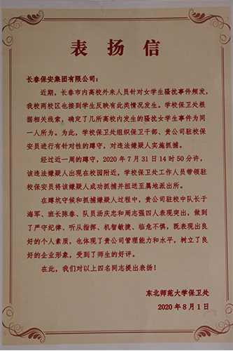 ??本次校園猥褻事件涉及范圍廣,社會(huì)影響較為惡劣,為周圍在校就讀大學(xué)生帶來(lái)了極大困擾。保安集團(tuán)站前分公司駐東北師大保衛(wèi)處執(zhí)勤中隊(duì)與東北師大保衛(wèi)處重拳出擊,將這名校園猥褻違法犯罪嫌疑人繩之以法,為莘莘學(xué)子們創(chuàng)造一片清澈的學(xué)習(xí)空間,保障校園安全,促進(jìn)社會(huì)和諧穩(wěn)定,做出應(yīng)有貢獻(xiàn)。