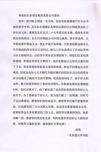 ??陳師傅回憶道,2020年5月27日一早,自己駕駛貨車行至凱達南街長久汽車物流公司附近,打算稍作停留休息再出發(fā)上路。這時,不知道是什么原因,貨車的輪胎部位開始冒煙并伴有明火,慌忙之際我匆忙下車,直面火災(zāi)的發(fā)生我有些手足無措,四處張望求助之際,只好就近來到長久汽車物流門衛(wèi)崗尋求幫助,此時保安員田玉宏同志也發(fā)現(xiàn)了貨車的狀況,他一邊拿起消防器材向外走,一邊請示分隊長楊柳和中隊長李中利。此時冒著黑煙的輪胎發(fā)出刺鼻的味道,沒人清楚起火點到底是哪里,田玉宏同志不顧汽車可能隨時爆炸給自身帶來的危險,迎著刺鼻的黑煙進行滅火。最終經(jīng)過努力,將火災(zāi)成功撲滅,避免了火災(zāi)的進一步蔓延,同時也最大程度的挽回了我的經(jīng)濟損失。“當我還在檢查車輛受損情況聯(lián)系保險公司的時候,執(zhí)勤保安員卻默默的離開了,經(jīng)過多方打聽和尋找,最終了解到幫助我的這些英雄的名字。”感謝信末尾,陳師傅寫到“我要向你們深深的鞠上一躬,真摯的感謝你們,感謝你們的無私無畏。”