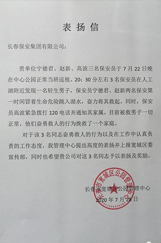 ??2020年7月22日晚20:15左右,保安集團寬城分公司駐長春市寬城區(qū)公園管理中心執(zhí)勤保安員寧德君、趙新、高波一如往常一樣在公園內(nèi)巡邏執(zhí)勤。三人剛巡邏至湖邊,便傳來游客呼救的喊聲:“有人跳進水里了,救命!”沒來得及多想,三名保安員立刻沖上前去查看情況。只見一名男子在水中奮力掙扎,岸邊還有游客在大聲呼喊著救命,在這種危急時刻,保安員高波立即撥打120急救電話并向上級反饋突發(fā)情況,保安員寧德君、趙新連身上的衣服都沒來得及脫,直接縱身跳入湖中朝著男子游去,由于當時天色較暗,湖水較深,兩名保安員只能借助周圍群眾手機微弱的燈光奮力營救跳湖男子,在眾人的不懈努力下,最終將男子救上岸邊,后被趕到的急救車送往醫(yī)院,經(jīng)搶救后脫離生命危險。