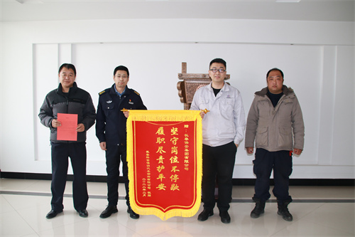 ? ?近日,長春科世得潤汽車部件有限公司行政經(jīng)理周生,在長春保安集團二道分公司駐勤分隊長王曉輝的陪同下,將一面寫有“堅守崗位不停歇,履職盡責護平安”的錦旗及一封感謝信送到長春保安集團總經(jīng)理助理、二道分公司經(jīng)理岳福成和二道分公司中隊長李豐手中,對長春保安集團二道分公司駐勤保安員在春節(jié)假期堅守崗位,履職盡責勇救火災(zāi)的突出表現(xiàn)給予充分好評和高度贊揚。