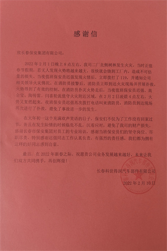 ? ?據(jù)悉,2022年2月1日晚8時,科世得潤二廠北側(cè)樹林發(fā)生火災(zāi),長春保安集團二道分公司當夜值班保安員遲強發(fā)現(xiàn)火情后,立即撥打119,并通知科世得潤相關(guān)領(lǐng)導(dǎo)火災(zāi)情況。消防員接警后立即到達火災(zāi)現(xiàn)場并開展撲救,火勢得到了有效控制。在消防員撲滅火勢走后,當夜值班保安員遲強、高金寶、陶傳雷、閆喜輪流值守火災(zāi)附近區(qū)域,在2月2日凌晨4時,火勢又復(fù)燃,保安員遲強再次撥打電話叫來消防員,消防員到達現(xiàn)場進行了二次撲救,避免了火災(zāi)蔓延到科世得潤工廠內(nèi),造成不可估量的損失。