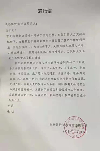 ? ?近日,長(zhǎng)春保安集團(tuán)收到一封來自吉林銀行長(zhǎng)春站前金街支行的表揚(yáng)信。信中對(duì)長(zhǎng)春保安集團(tuán)經(jīng)開分公司駐吉林銀行長(zhǎng)春站前金街支行保安員們?yōu)橹许樌麖?fù)工復(fù)產(chǎn)提供的有力保障給予了充分肯定和高度贊揚(yáng)。