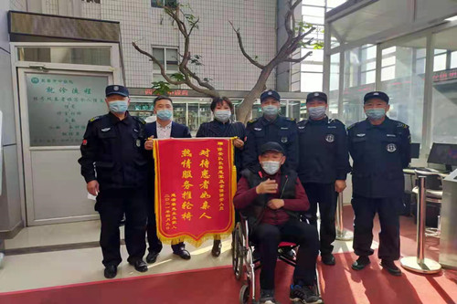??寬城分公司駐勤的長春市中醫(yī)院,有一名男性腦血栓患者,從2020年4月起,每天由他愛人周女士推輪椅來院做康復(fù)治療,至今已經(jīng)有一年時間。由于醫(yī)院進門的地方有一個大的坡道,給他們進出帶來了極大不便。每天來院,在崗的保安員們都會幫他們推輪椅進院,做完康復(fù)治療后保安員們再幫忙推輪椅把他們送出醫(yī)院,一年時間里,天天如此,從未間斷。在實際工作中,他們不僅幫助周女士夫婦,其他患者來看病就診,只要是坐輪椅的執(zhí)勤隊的保安員們都會熱情幫忙。近日,患者家屬為表示感謝,特給他們送來錦旗一面。
