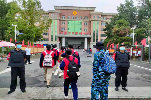 ? ?開學(xué)首日,文教大隊分駐全市各中小學(xué)的800余名保安員全員上陣,嚴(yán)格履職,積極配合校方進(jìn)行疫情防控、車輛管理和現(xiàn)場安全秩序維護(hù)工作。園區(qū)外保安員負(fù)責(zé)指揮接送車輛有序停放,保證道路暢通;門崗處則有專人負(fù)責(zé)防暴恐以及體溫測量和健康碼查驗。除此之外,還有熱心保安員為剛?cè)雽W(xué)的新生進(jìn)行引導(dǎo)。校園安保工作有條不紊、秩序井然。