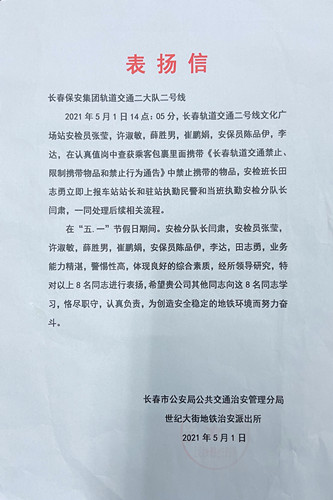 ? ?2021年5月1日,長春軌道交通二號線文化廣場站,長春保安集團(tuán)軌道交通大隊(duì)在此駐勤的安檢員張瑩、許淑敏、薛勝男、崔鵬娟在執(zhí)勤過程中查獲乘客攜帶國家明令禁止私藏私帶的違禁品,為確保地鐵及乘客安全,第一時(shí)間聯(lián)系安檢班長田志勇。田志勇接到上報(bào)后帶領(lǐng)保安員陳品伊、李達(dá)到達(dá)現(xiàn)場維護(hù)秩序并上報(bào)中段區(qū)執(zhí)勤安檢分隊(duì)長閆肅、車站站長及駐站執(zhí)勤民警,共同妥善處理了后續(xù)相關(guān)事宜。事后,長春軌道交通集團(tuán)有限公司運(yùn)營事業(yè)總部運(yùn)營二中心、長春市公安局公共交通治安管理分局世紀(jì)大街地鐵治安派出所給集團(tuán)發(fā)來表揚(yáng)信,表揚(yáng)了這些安檢員、保安員們恪盡職守、認(rèn)真負(fù)責(zé),為創(chuàng)造安全穩(wěn)定的地鐵環(huán)境而努力工作的精神,并對他們一直以來在工作中的優(yōu)異表現(xiàn)給予了充分肯定和高度評價(jià)。集團(tuán)軌道交通大隊(duì)對他們進(jìn)行了表彰、獎勵。