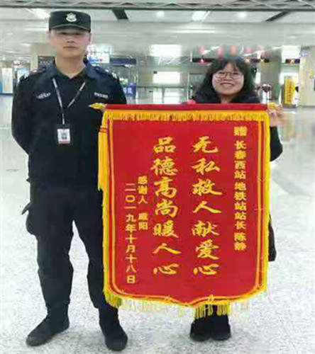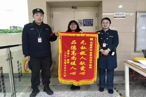 11月10日上午,這名當(dāng)事女乘客專門來到長春西站贈送一面錦旗,感謝安檢員臺宇航、安保員全超在她暈倒之后對她施之救助、悉心照顧,使其脫離了生命危險。