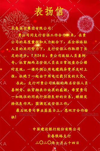 ??2020年8月3日,長(zhǎng)春保安集團(tuán)收到來(lái)自中國(guó)建設(shè)銀行長(zhǎng)春鐵路支行送來(lái)的表?yè)P(yáng)信,信中對(duì)長(zhǎng)春保安集團(tuán)金融大隊(duì)駐中國(guó)建設(shè)銀行長(zhǎng)春鐵路支行保安員姜樹奇和杜宵翔二人在執(zhí)勤期間勤勤懇懇、任勞任怨的工作態(tài)度提出贊揚(yáng)與鼓勵(lì),并號(hào)召全體駐中國(guó)建設(shè)銀行保安員向二人學(xué)習(xí)。
