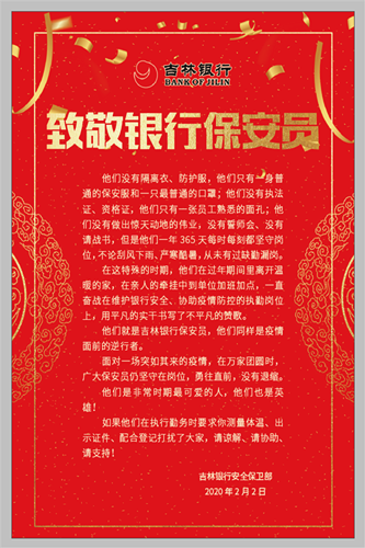 ??吉林銀行向堅(jiān)守在防疫一線的經(jīng)開保安分公司駐勤保安員致敬!