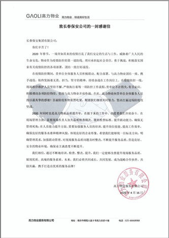 ? 2020年4月16日,高力物業(yè)給集團(tuán)發(fā)來感謝信,感謝集團(tuán)文教大隊(duì)駐高力物業(yè)保安執(zhí)勤隊(duì)全體保安員在配合本單位抗擊新冠肺炎疫情的過程中,堅(jiān)守崗位、勇于擔(dān)當(dāng)、表現(xiàn)突出,為本單位做好疫情防控工作發(fā)揮了重要助力作用。