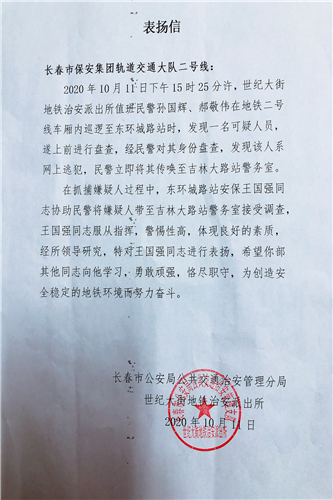 ??事后,長春市公安局公共交通治安管理分局世紀(jì)大街地鐵治安派出所送來一封表揚信,以表對長春保安集團軌道交通大隊地鐵二號線駐勤安檢員王國強警惕性高、勇敢頑強的工作態(tài)度高度認(rèn)可。