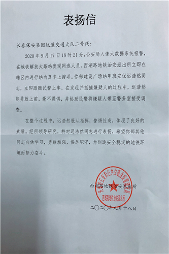 ??2020年9月17日18時許,長春市公安局西湖路地鐵治安派出所值班民警在地鐵二號線解放大路站發(fā)現(xiàn)網(wǎng)上在逃人員,長春市西湖路地鐵治安派出所立即在轄區(qū)內(nèi)進(jìn)行站內(nèi)搜尋。長春保安集團軌道交通大隊二號線駐勤安檢員遲浩然,在接到公安機關(guān)協(xié)助抓捕網(wǎng)上在逃人員的請求后,立即跟隨公安民警進(jìn)站搜尋。經(jīng)過近半個小時的拉網(wǎng)式排查后,在公安民警和安檢員遲浩然的不懈努力下,最終將嫌疑人帶至警務(wù)室接受調(diào)查。次日,長春市公安局公共交通治安管理支隊西湖路地鐵治安派出所特送來一封表揚信,以表達(dá)對長春保安集團軌道交通大隊二號線駐勤安檢員遲浩然在協(xié)助公安機關(guān)抓捕犯罪嫌疑人過程中勇敢向前、毫不畏懼的職業(yè)精神的高度贊揚及鼓勵。
