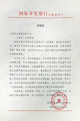 ? ?張琳表示,保障客戶單位的安全,是長(zhǎng)春保安集團(tuán)不變的使命和承諾。國(guó)家開發(fā)銀行吉林分行的鼓勵(lì)和支持,讓我們有信心把分行的安保工作做的更好。在今后的工作中,我們一定繼續(xù)堅(jiān)持以分行為先,充分從分行的安全需求出發(fā),全力為國(guó)家開發(fā)銀行吉林分行筑牢堅(jiān)固的安全防線。
