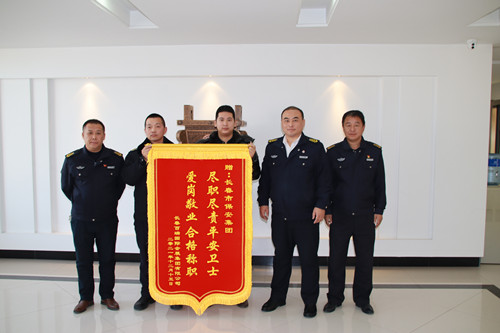 ? ?近日,長(zhǎng)春百瑞國(guó)際會(huì)展集團(tuán)有限公司李致達(dá)將一面寫有“盡職盡責(zé)平安衛(wèi)士,愛(ài)崗敬業(yè)合格稱職”的錦旗及一封感謝信送到長(zhǎng)春保安集團(tuán)人力資源部總監(jiān)張旭、北湖分公司經(jīng)理梁紹輝、北湖分公司中隊(duì)長(zhǎng)邵興亮、二道分公司中隊(duì)長(zhǎng)李豐手中,對(duì)長(zhǎng)春保安集團(tuán)二道分公司為百瑞集團(tuán)主承辦的各類展會(huì)活動(dòng)提供的有力保障和幫助表達(dá)誠(chéng)摯的感謝,并對(duì)全體執(zhí)勤保安員認(rèn)真負(fù)責(zé)、恪盡職守的工作態(tài)度給予高度贊揚(yáng)。