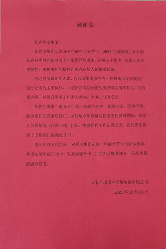 ? ?感謝信中提到,展會(huì)期間,長(zhǎng)春保安集團(tuán)總經(jīng)理助理、二道分公司經(jīng)理、大型執(zhí)勤活動(dòng)指揮調(diào)度中心主任岳福成作為現(xiàn)場(chǎng)總指揮,指揮有方,大局觀念強(qiáng),對(duì)展會(huì)服務(wù)工作親力親為,對(duì)客戶認(rèn)真負(fù)責(zé)。帶領(lǐng)全體參勤保安員出色的完成了各項(xiàng)安保工作,確保每場(chǎng)展會(huì)安全有序舉辦。