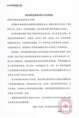 近日,瀚德(中國)汽車密封系統(tǒng)有限公司長春分公司給集團發(fā)來感謝信,感謝綠園保安分公司駐本企業(yè)保安執(zhí)勤隊認真履職、強化措施,全力做好疫情防控工作,為企業(yè)復工、復產提供安全保障。