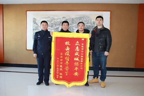 ? ?近日,長春市中醫(yī)院保衛(wèi)科科長周占宇、科員谷沛霖蒞臨長春保安集團(tuán),代表長春市中醫(yī)院將一面印有“眾志成城保平安,抗擊疫情辛苦啦”的錦旗送到了長春保安集團(tuán)寬城分公司經(jīng)理黃繼成、中隊(duì)長洛家慶手中,對長春保安集團(tuán)寬城分公司駐長春市中醫(yī)院保安執(zhí)勤隊(duì)長期以來的安保工作和疫情防控工作給予充分肯定和高度贊揚(yáng)。