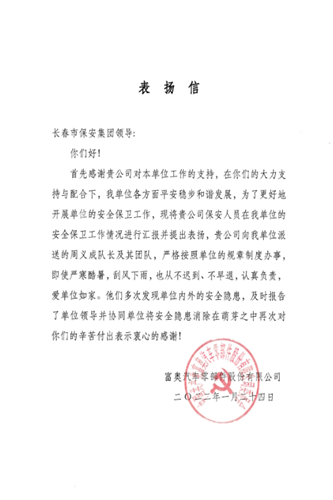 ? ?近日,長(zhǎng)春保安集團(tuán)收到一封來(lái)自富奧汽車(chē)零部件股份有限公司的表?yè)P(yáng)信。信中對(duì)長(zhǎng)春保安集團(tuán)綠園分公司駐富奧汽車(chē)零部件股份有限公司保安執(zhí)勤隊(duì)盡職盡責(zé)、熱忱服務(wù)的工作表現(xiàn)給予充分肯定和高度贊揚(yáng)。
