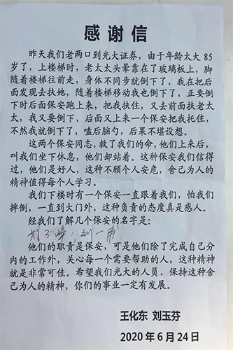 ??6月23日,劉一甫與另一名保安員劉玉峰在光大銀行執(zhí)勤時,王化東、劉玉芬(老兩口)兩位老人乘扶梯到光大銀行樓上的光大證券辦理業(yè)務(wù),在坐扶梯上樓時,85歲的劉玉芬因頭暈靠在了玻璃板上,腳隨著樓梯往上走,身體卻不同步而摔倒。身后的王化東趕緊去扶她。但樓梯繼續(xù)向上滾動的慣力,使劉玉芬老人身子后仰把王化東也壓倒了,繼續(xù)下去兩位老人后腦勺著地就會有生命危險。在這緊急關(guān)頭,保安員劉一甫以最快的速度奔到兩位老人身邊,先扶住王化東老人,又去扶前面的劉玉芬老人,隨后趕到的保安員劉玉峰把王化東老人扶住,一直把他們護送到安全區(qū)域,確保了他們的生命安全。在辦理完業(yè)務(wù)下樓時,劉一甫一直跟著兩位老人并護送至大門外。兩位老人事后給光大銀行送來感謝信,表揚保安員劉一甫、劉玉峰助人為樂的高尚行為。光大銀行吉林省分行的領(lǐng)導(dǎo)們知道此事后,深受感動,特來集團為兩位保安員贈送錦旗,感謝集團,感謝兩位助人為樂的保安員。