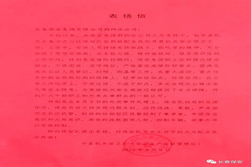 ? ?長春市機關(guān)事務(wù)管理局保衛(wèi)處對長春保安集團(tuán)朝陽分公司駐勤保安執(zhí)勤隊工作的充分肯定和高度評價,對駐勤優(yōu)秀保安員的表彰獎勵,將極大激發(fā)駐勤保安執(zhí)勤隊全體保安員把進(jìn)一步做好各項安保工作的熱情和斗志,為繼續(xù)保衛(wèi)好黨政機關(guān)安全,迎接黨的“二十大”勝利召開作出應(yīng)有貢獻(xiàn)。