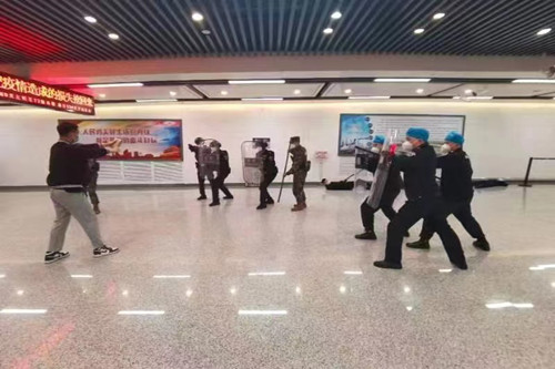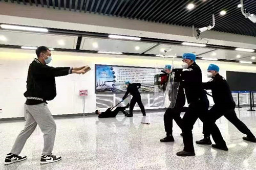 ? 駐龍嘉機(jī)場(chǎng)防暴檢測(cè)中隊(duì)在本次活動(dòng)中,參加了安檢和防暴恐兩個(gè)項(xiàng)目的演練。安檢演練主要通過(guò)駐勤保安員通過(guò)技術(shù)手段,對(duì)進(jìn)出港乘客所攜帶的物品進(jìn)行嚴(yán)格安檢,及時(shí)發(fā)現(xiàn)易燃、易爆及違禁品,有效避免漏檢造成安全事故。防暴恐突發(fā)事件演練,主要現(xiàn)場(chǎng)模擬突發(fā)歹徒在機(jī)場(chǎng)內(nèi)行兇鬧事,駐勤保安員及時(shí)發(fā)現(xiàn)后,迅速啟動(dòng)應(yīng)急突發(fā)事件預(yù)案,通過(guò)保安員集體合圍、正確使用防暴器械有效控制住歹徒,然后迅速報(bào)警,將歹徒及時(shí)交給警方處置。演練活動(dòng)效果逼真、實(shí)戰(zhàn)性強(qiáng),極大增強(qiáng)了全體駐勤保安員的安全防范意識(shí),大幅提升了保安員安檢水平和有效處置暴恐突發(fā)事件的應(yīng)急反應(yīng)、有效處置能力。