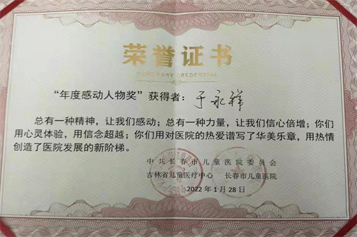 ? ?在醫(yī)院川流不息的人群中,每天都上演著暖心的小故事,一聲您好,一個微笑,一次幫扶......于永祥保一方平安的同時,盡己所能讓醫(yī)護(hù)人員和就醫(yī)的患者感受到方便和舒心。他的工作表現(xiàn),長春市兒童醫(yī)院的領(lǐng)導(dǎo)們也看在眼里,多次對其愛崗敬業(yè)的工作態(tài)度和愛院如家的優(yōu)良品質(zhì)予以了高度贊揚,并專門召開黨委會,研究決定授予于永祥“2021年度感動人物獎”。