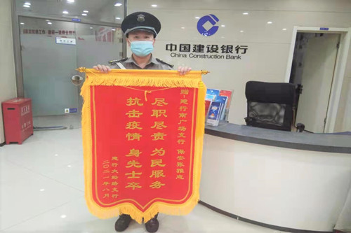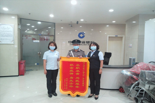 ? ?近日,中國(guó)建設(shè)銀行長(zhǎng)春大經(jīng)路支行副行長(zhǎng)許莉,將一面印有“盡職盡責(zé),為民服務(wù),抗擊疫情,身先士卒”的錦旗送到長(zhǎng)春保安集團(tuán)金融大隊(duì)駐中國(guó)建設(shè)銀行長(zhǎng)春南廣場(chǎng)支行保安員張雅志手中,對(duì)他愛崗敬業(yè)、忠于職守、熱情服務(wù)的出色表現(xiàn)給予高度認(rèn)可。